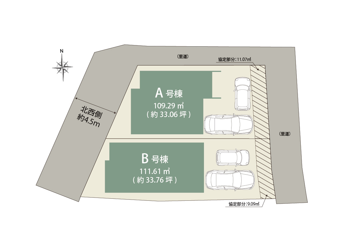 準防火地域、法22条区域、下水道処理区域、第2種高度地区、宅地造成等工事規制区域 ※協定部分あり(A号棟:11.07㎡、B号棟:9.09㎡)※北側通路・東側通路は里道となり、建築基準法上の道路ではございません。